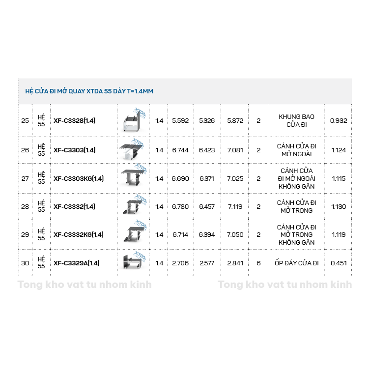 Đặt mua HỆ CỬA ĐI MỞ QUAY XTDA 55 DÀY T=1.4MM