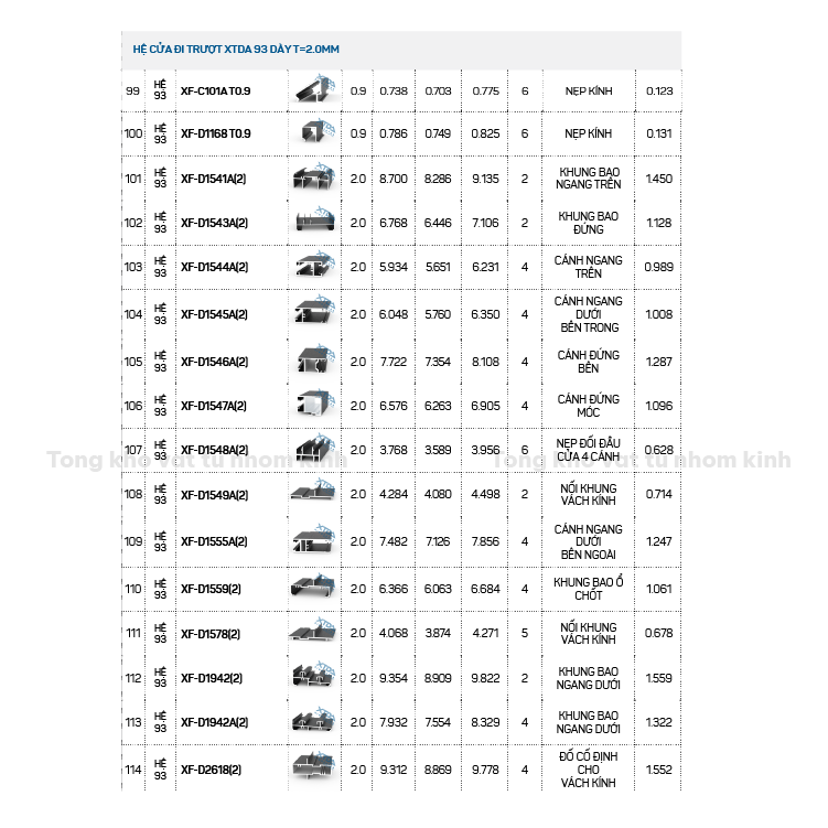 Đặt mua HỆ CỬA ĐI TRƯỢT XTDA 93 DÀY T=2.0MM