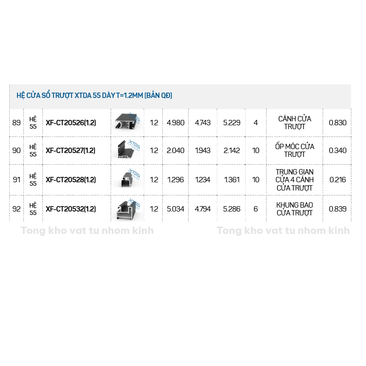 Đặt mua HỆ CỬA SỔ TRƯỢT XTDA 55 DÀY T=1.2MM (BẢN QĐ)
